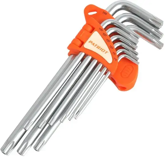 Этот набор ключей Patriot SKТ-9L включает 9 предметов, которые пригодятся для различного ремонта и обслуживания. В комплект входят ключи TORX разного размера T10-T50, что позволяет работать с разными крепежными элементами. Также в набор входят длинные ключи, предназначенные для доступа к труднодоступным местам. В комплекте есть угловые шестигранные ключи, которые помогают закреплять и откручивать соединения в сложных уголках. Все ключи выполнены из прочного материала, что обеспечивает их долговечность и надежность. Такой набор удобно хранить и брать с собой в ремонтных работах. Он подходит для профессионального использования и домашнего ремонта. Разнообразие типов имеет смысл для выполнения различных задач без необходимости покупки дополнительных инструментов.