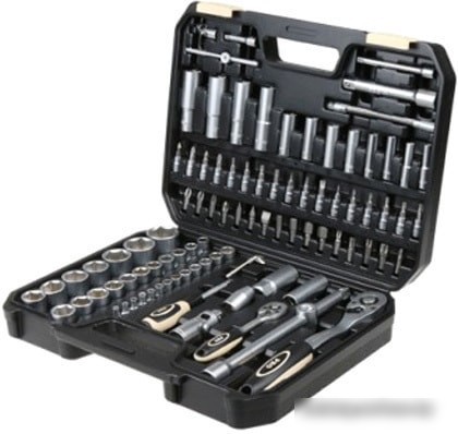 | Комплектация | Торцевые головки 1/2" - 18 предметов: (10, 11, 12, 13, 14, 15, 16, 17, 18, 19, 20, 21, 22, 23, 24, 27, 30, 32мм)Торцевые головки 1/4" - 13 предметов: (4, 4.5, 5, 5.5, 6, 7, 8, 9, 10, 11, 12, 13, 14мм) Глубокие торцевые головки 1/2" - 4 предмета: (14, 15, 17, 19мм)Глубокие торцевые головки 1/4" - 8 предметов: (6, 7, 8, 9, 10, 11, 12, 13мм) Трещотка - 2 (1/2", 1/4") Кардан - 1/2", 1/4" Удлинители 1/2" - 2 (125 и 250мм) Удлинители 1/4" - 2 (50 и 100мм) Удлинитель гибкий -1/4" Отвертка под биты - 1/4" Вороток - 1/4" Головки свечные 1/2" - 2 предмета: (16 мм, 21 мм) Переходник Шестигранные ключи - 3 предмета (1.5, 2, 2.5) Биты-насадки 1/2" - 15: HEX: 8, 10, 12, 14 SL: 8, 10, 12 PH: 3, 4 PZ: 3, 4 T: 40, 45, 50, 55 Биты-насадки 1/4" - 17: HEX: 3, 4, 5, 6 SL: 4, 5.5, 7 PH: 1, 2 PZ: 1, 2 T: 8, 10, 15, 20, 25, 30 |