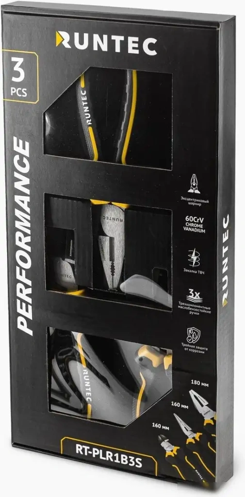 | Комплектация | Плоскогубцы комбинированные RUNTEC RT-PLR01180 180 мм — 1 шт. Длинногубцы RUNTEC RT-PLR02160 160 мм — 1 шт. Бокорезы RUNTEC RT-PLR04160 160 мм — 1 шт. |