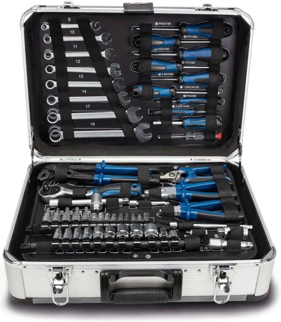 Этот универсальный набор инструментов Scheppach TB150 содержит 101 предмет для работы в домашних и гаражных условиях. В комплект входят торцевые головки разных размеров, трещотка и T-образный вороток, которые позволяют быстро и удобно затягивать или откручивать болты и гайки. Удлинители и кардан обеспечивают доступ к труднодоступным местам. В наборе есть комбинированные и угловые ключи, пассатижи, клещи переставные и рулетка для точных измерений. Также в комплект входят молоток, ножницы, нож, ножовка, отвертки с различными насадками и биты, что делает его очень универсальным. Головки со вставками позволяют фиксировать крепеж надежнее. Это набор, который покрывает большинство бытовых и автослесарных задач.