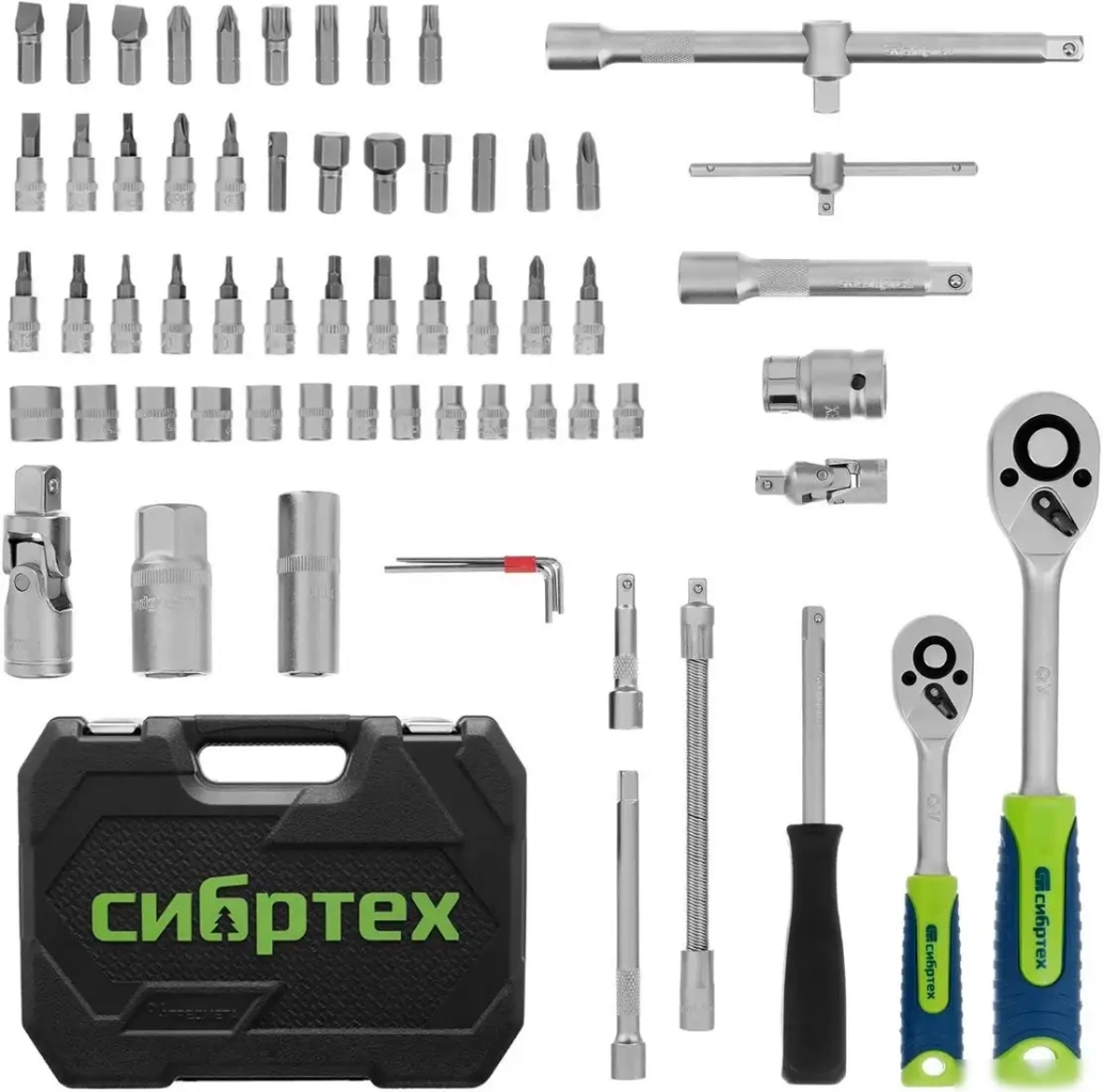 Универсальный набор инструментов СибрТех 13388 включает 94 предмета, что делает его удобным для различных ремонтных задач. В комплект входят торцевые головки с размером 1/4" и 1/2", а также глубокие головки для работы в труднодоступных местах. Трещотка с переключением поможет быстро и легко затягивать или откручивать болты и гайки. В наборе есть Т-образный вороток, карданные и шарнирные воротки, а также удлинители разных длин для удобства использования. Насадки-отвертки (биты) позволяют справиться с разными типами винтов. Головки со вставкой делают смену насадок быстрой и простой. Такой набор подходит для домашних и профессиональных задач благодаря своему разнообразию. Он включает все необходимые инструменты для работы с болтами, гайками и винтами.