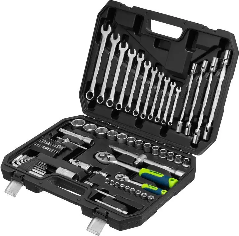 Этот универсальный набор инструментов СибрТех 13396 содержит 89 предметов, что делает его хорошим помощником для различных ремонтных работ. В комплект входят торцевые головки двух размеров: 1/4" и 1/2", а также свечные головки, что позволяет легко обслуживать автомобиль или мотоцикл. В набор включены разнообразные насадки, такие как шестигранные, звездочки, крестовые и шлицевые, что обеспечивает широкий спектр применения. В комплекте есть трещотки, воротки и ключи, включая торцевые и комбинированные, для удобства и эффективности работы. Удлинители и кардан помогают достигать труднодоступных болтов и гаек. Все инструменты изготовлены из прочных материалов и удобно хранятся в компактной коробке. Также есть отвертка под биты и насадки, чтобы быстро заменить инструмент под задачу. Этот набор позволяет выполнять работы дома или в мастерской, объединяя в себе все необходимые инструменты.