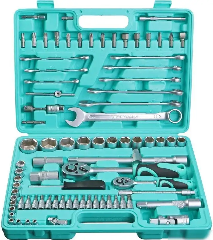 | Комплектация | 12 х Головки торцевые 1/2": 14, 15, 16, 17, 18, 19, 20, 22, 24, 27, 30, 32 мм; 2 x Головки торцевые свечные 1/2": 16, 21 мм; 1 x Рукоятка трещоточная 1/2", 45 зубьев; 2 x Удлинитель 1/2": 125, 250 мм; 1 x Шарнир карданный 1/2"; 1 х Держатель бит 1/2" x 5/16"; 1 х Удлинитель гибкий 1/4" х 6"; 1 х Адаптер для торцевых головок 1/2", 50 мм; 1 х Переходник 1/2" x 3/8"; 9 х Ключи комбинированные: 8, 10 ,11, 12, 13, 14, 17, 19, 22 мм; 13 х Головки торцевые 1/4": 4, 4,5, 5, 5,5, 6, 7, 8, 9, 10, 11, 12, 13, 14 мм; 1 x Рукоятка трещоточная 1/4", 45 зубьев; 2 х Адаптер для торцевых головок 1/4": 25, 50 мм; 2 x Удлинитель 1/4": 50, 100 мм; 1 x Шарнир карданный 1/4"; 1 x Вороток Т-образный 1/4"; 1 x Отвертка-вороток 1/4"; 17 x Головки с вставками 1/4", 32мм: Torx: Т8, Т10, Т15, Т20, Т25, Т30; Philips: PH1, PH2; Pozidriv: PZ1, PZ2; Hex: H3, H4, H5, H6; Slotted: SL4, SL5,5, SL7; 15 x Биты 5/16": Torx: T40, T45, T50, T55; Philips: PH3, PH4; Pozidriv: PZ3, PZ4; Hex: H8, H10, H12, H14; Slotted: SL8, SL10, SL12 |