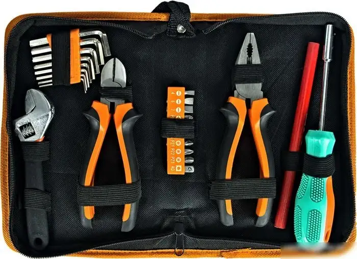 | Комплектация | Пассатижи; Бокорезы; Разводной гаечный ключ; Набор шестигранных ключей (8 шт); Наюор бит (10 шт); Карандаш строительный; Отвертка |