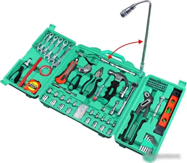- Комплектация из 98 предметов — всё необходимое для разной работы в доме и мастерской.