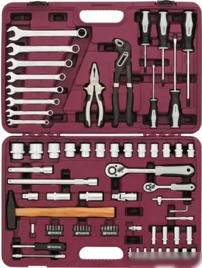 Этот универсальный набор инструментов Thorvik UTS0077MP включает 77 предметов, что позволяет выполнять разные виды ремонта и сборки. В набор входят торцевые головки различных размеров и типов, а также трещоточные рукоятки и воротки, что облегчает работу с труднодоступными болтами и гайками. Есть удлинители и карданный шарнир для удобства в сложных местах, а также адаптеры и вставки-биты для различных типов крепежа. В комплекте также есть ключи, отвертки и молоток для широкого применения. Все инструменты аккуратно уложены в прочный кейс, который легко хранить и переносить.