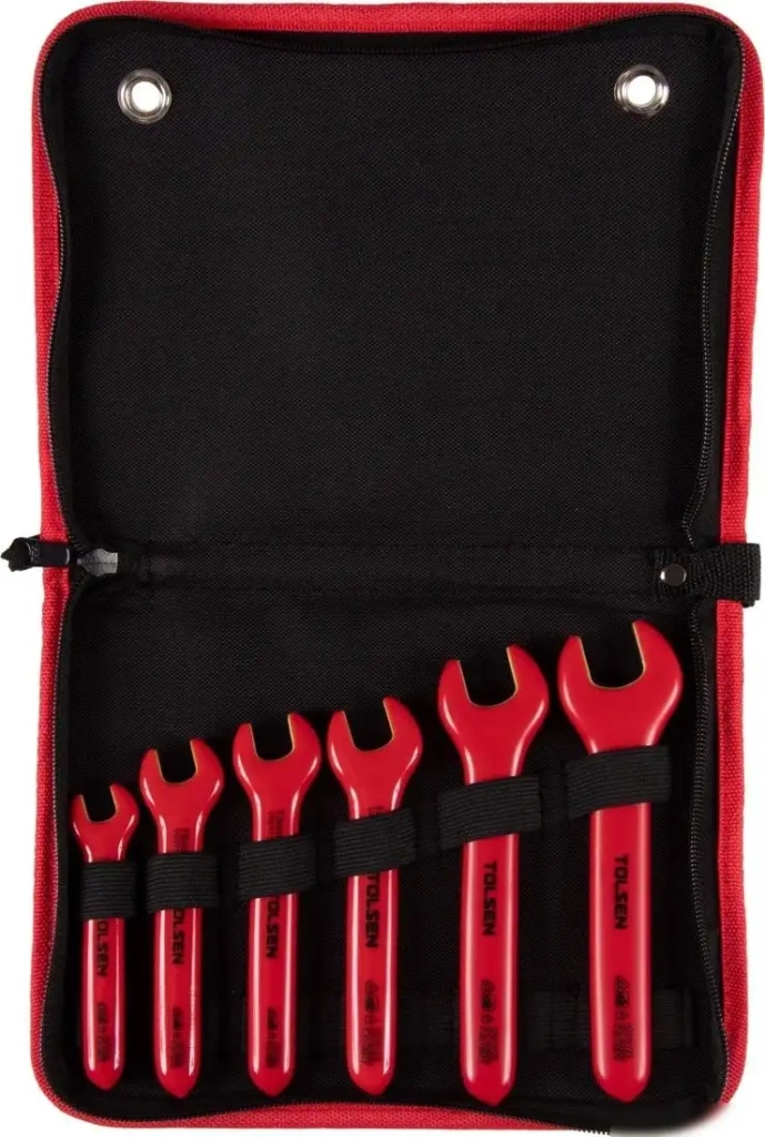 Этот набор ключей Tolsen TTV83606 включает 6 диэлектрических рожковых ключей разных размеров: 10, 12, 13, 14, 17 и 19 мм. Все ключи созданы из прочных материалов и имеют изолирующее покрытие, что повышает безопасность при работе с электрическими соединениями. В комплект входит удобный капроновый футляр на молнии, который позволяет легко хранить и транспортировать инструменты. Набор предназначен для работы с различными гайками и болтами, обеспечивая надежное сцепление. Он подходит для электромонтажных работ, где важна защита от электрического удара. Все ключи легко держатся в руке и позволяют выполнять работу быстро и точно. Благодаря компактной комплектации, набор удобно брать с собой на объекты. Особенность набора — диэлектрические свойства, которые увеличивают безопасность при работе с электрооборудованием.