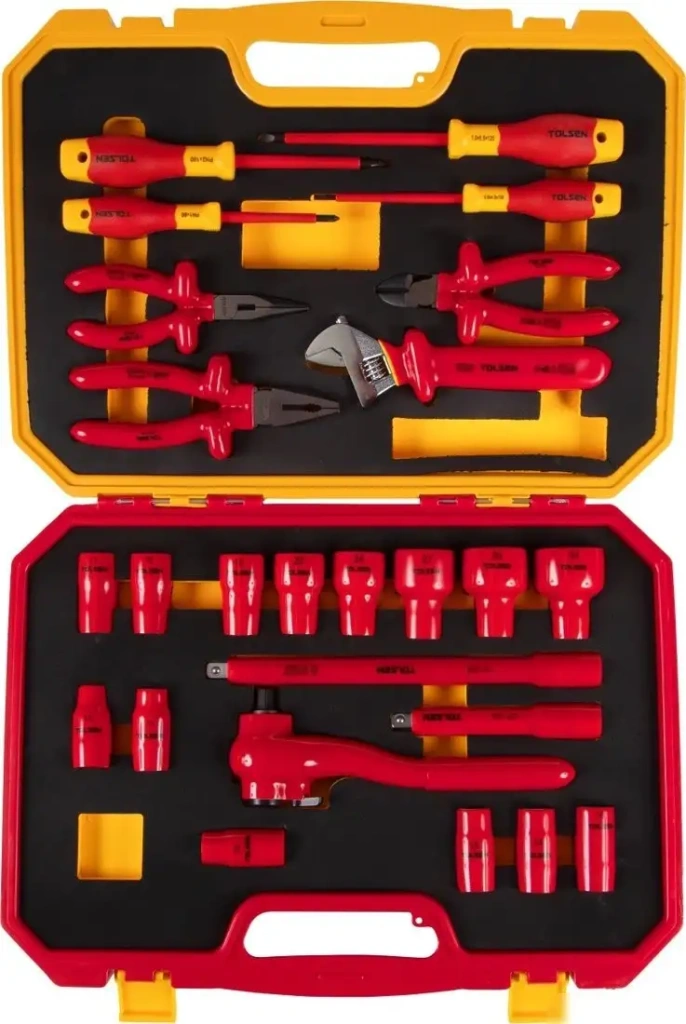 | Комплектация | Головки и принадлежности 1/2" диэлектрические, ключ разводной диэлектрический, отвёртки диэлектрические, шарнирно-губцевый инструмент диэлектрический, тестер-отвёртка для проверки напряжения, кейс |