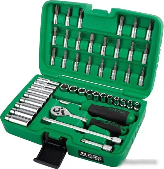 Этот универсальный набор инструментов Toptul GCAI4601 содержит 46 предметов, которые подойдут для различных задач по ремонту и обслуживанию. В комплект входят торцевые и глубокие торцевые головки размером 4-13 мм, а также удлинители 50 и 150 мм, что облегчает доступ к труднодоступным местам. В наборе есть трещотка и отвертка под биты, что делает работу более удобной и быстрой. Обратите внимание, что все инструменты не диэлектрические, поэтому их можно использовать только для работы с неэлектрическими компонентами. Удобная комплектация позволяет иметь всё необходимое в одном наборе, что экономит место и время. Этот набор отлично подходит как для профессионалов, так и для домашних мастеров, стремящихся к качественной работе.