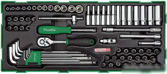 Этот универсальный набор инструментов Toptul GTB7202 включает 72 предмета для различных ремонтных задач. В комплект входят торцевые головки и глубокие головки размером от 4 до 14 мм, которые позволяют быстро и удобно затягивать или ослаблять болты и гайки. Также в наборе есть разнообразные биты: шлицевые, крестовые, Pozidrive и TORX, что обеспечивает работу с разными крепежными элементами. Для удобства использования предусмотрены реверсивная трещотка, Т-образный вороток, кардан и гибкие удлинители, облегчающие доступ к труднодоступным местам. В комплекте есть длинные торцевые головки и угловые ключи, что расширяет возможности для работы в ограниченных пространствах. Вся оснастка выполнена из прочных материалов, что гарантирует долгий срок службы и стабильную работу. Эта сумка отлично подходит для тех, кто ищет универсальный набор для домашних ремонтов или профессионального использования.