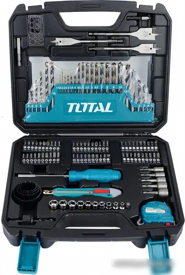 Этот набор домашнего мастера Total THKTAC011182 включает 118 предметов, необходимых для различных ремонтных работ. В комплект входит множество бит, сверл по дереву, металлу и бетону, а также разные насадки и головки. Вам доступны как стандартные отвертки, так и специальные инструменты для более сложных задач. В наборе есть магнитные держатели бит и переходник, что облегчает работу и повышает точность. В комплект также входит рулетка длиной 3 метра и нож с отламывающимся лезвием, что удобно для измерений и разрезки. Всё аккуратно хранится в пластиковом кейсе, который помогает поддерживать порядок и быстро находить нужный инструмент.