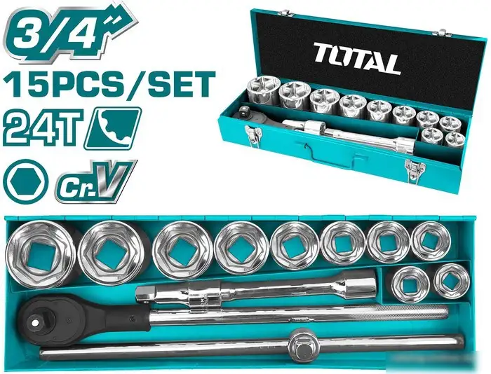 Этот набор из 15 предметов предназначен для выполнения различных ремонтных работ. В комплект входит трещотка с размером 3/4" и десять торцевых головок разного диаметра, что помогает справляться с разными задачами. Также в наборе есть удлинители длиной 100 мм и 200 мм для доступа к труднодоступным местам, и выдвижной тройник длиной 520 мм для увеличения диапазона работы. Всё аккуратно упаковано в прочный металлический кейс, что облегчает хранение и транспортировку. Удобство пользования обеспечивают надежные механизмы и хорошо подобранные размеры. Этот набор подойдёт как для профессионалов, так и для домашних мастеров.