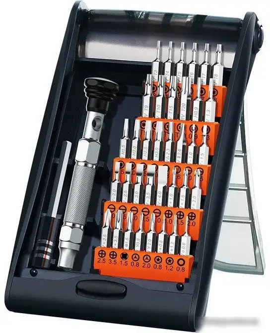 | Комплектация | Магнитный удлинитель - 60мм; Отвертка под биты; Phillips - 1.0, 1.5, 2.0, 2.5, 3.5; Flathead - 1.0, 1.5, 2.0, 2.5, 3.0, 3.5, 4.0; Pentalobe - 0.8, 1.2; Torx - T3 - T10 + T15, T20; Tri-wing - 0.8, 2.0; Spanner - 1.6; Star - 0.8, 1.2 ; Pozidriv - Y0.8, Y2.0. |