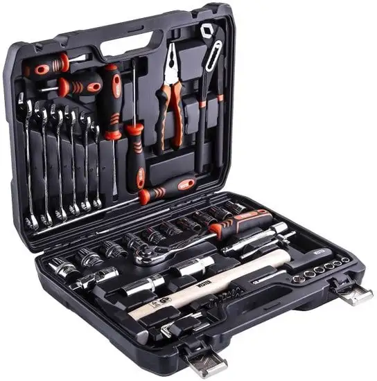 | Комплектация | - Головки торцевые 1/4" 6 граней: 8, 9, 10, 11, 12, 13 мм- Отвертка - держатель 1/4" 150 мм- Адаптер для бит 1/4"DR x 1/4"НDR- Биты: L = 25 мм PH1, PH2, PH3, SL3, SL4, SL5, SL6, Т10, Т15,Т20, Т25, Т27, Т30, Т40- Вороток Т - образный 1/4" 115 мм- Головки торцевые 1/2" 6 граней: 10, 12, 13, 14, 15, 17, 19, 22, 24, 27 мм- Свечные головки 1/2": 16, 21 мм- Трещотка 1/2" 72 зуба- Удлинитель 1/2" 125 мм- Кардан 1/2" 70 мм- Ключи шестигранные Г-образные: 1.5, 2, 3, 4 мм- Ключи комбинированные : 10, 12, 13, 14, 15, 17 мм- Молоток 300 г- Плоскогубцы комбинированные 175 мм- Переставные клещи 250 мм- Отвертки: PH2 x 38 мм, PH2 x 100 мм, PZ3 x 200 мм,SL6 x 38 мм, SL6 x 100 мм |
