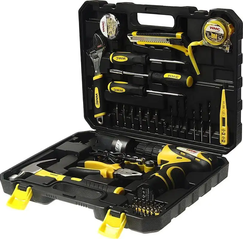 Универсальный набор инструментов WMC Tools 2068 включает 9 головок и 6 сверл, что позволяет выполнять разные работы дома и в гараже. В комплект входит водонепроницаемая аккумуляторная дрель мощностью 12 В, а также сменный аккумулятор для продолжительной работы. В наборе есть магнитный битодержатель и удобная рукоятка, что облегчает процесс ремонта. Включены также универсальный нож, пассатижи и молоток-гвоздодёр, чтобы справиться с разными задачами. В комплект входят биты по дереву и металлу, а также изолента для защиты проводов. Вся эта комплектация хранится в пластиковом кейсе, что упрощает транспортировку и хранение. Благодаря высокой функциональности и качеству сборки, набор подходит для домашнего использования и мелкого ремонта.