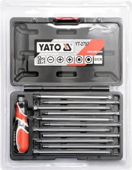 Набор отверток Yato YT-2797 включает 12 предметов, которые понадобятся в различных ремонтных работах. В набор входят отвертки с наконечниками типа Slotted, Philips, Pozidriv, Hex и Torx, что позволяет работать с разными типами крепежа. Некоторые отвертки двухсторонние, что увеличивает их функциональность и удобство использования. В комплект также есть отвертка, которая подходит для работы с бита-головками, что облегчает замену насадок. Такой набор подойдет как для домашних, так и для профессиональных задач. Благодаря компактной комплектации, его легко взять с собой везде. Все отвертки выполнены из прочных материалов, что обеспечивает их долговечность. Удобные рукоятки позволяют надежно захватывать инструмент и работать с ним без усталости. Этот набор поможет вам быстро и качественно выполнить ремонт или сборку разнообразных конструкций.