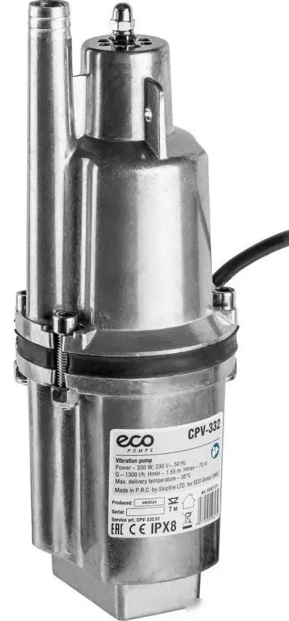 Колодезный насос ECO CPV-332 предназначен для водоснабжения. Он устанавливается вертикально и погружается в колодец на глубину до 7 метров. Насос работает с перекачиваемой чистой водой при температуре до 35°C и обеспечивает производительность до 1.3 кубометров в час. Модель выполнена из легкого алюминия, что облегчает установку и использование. Мощность насоса составляет 330 Вт, а напор достигает 70 метров, что позволяет подавать воду на значительные расстояния и высоты. Для подключения используется разъем диаметром 0,75 дюйма, а кабель длиной 25 метров обеспечивает удобство установки. В комплект входит насос, капроновый шнур, хомут, инструкция и коробка. Этот насос надежен, прост в использовании и отлично подходит для частных домов и дач. Благодаря качественной сборке он долго прослужит без сложного обслуживания. Он эффективно справляется с задачами водоснабжения, сохраняя стабильную работу.