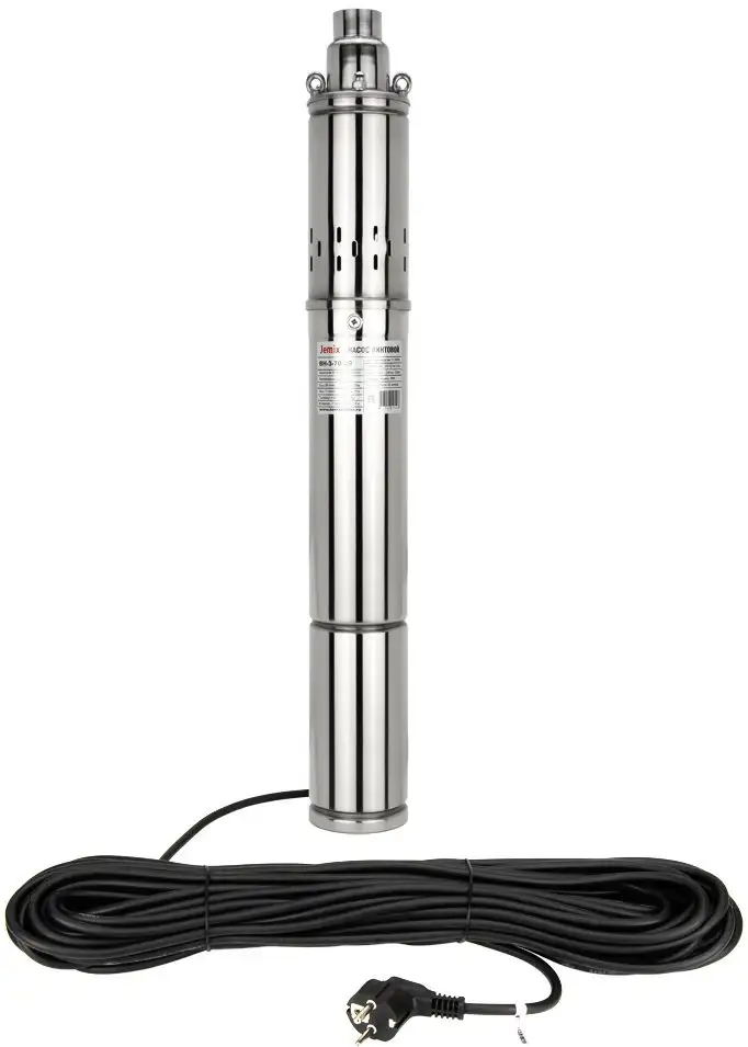 Скважинный насос Jemix ВН-3-90-32 предназначен для подачи чистой воды из глубоких скважин. Он работает вертикально и погружается до глубины 35 метров, что позволяет использовать его в различных условиях. Насос производится из нержавеющей стали, что делает его долговечным и устойчивым к коррозии. Его мощность составляет 550 Вт, а производительность достигает 1.2 кубометра в час с максимальным напором 33 метра. Он подходит для перекачки воды с частицами до 1 мм и работает при температуре от 2 до 30 °C. Благодаря длинному кабелю в 25 метров, его удобно устанавливать даже на больших глубинах.