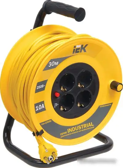 Удлинитель IEK УК30 WKP14-10-04-30 длиной 30 метров идеально подходит для использования в помещениях и на улице. Он оснащен четырьмя розетками Schuko с заземлением, чтобы подключать несколько устройств одновременно. Кабель имеет сечение 1 мм² и легко сворачивается в катушку, что удобно для хранения. Максимальная нагрузка составляет 2200 Вт при токе до 10 А, что обеспечивает безопасность и надежность. В удлинителе есть кнопка включения и защиты от перегрева, повышения напряжения и короткого замыкания. Корпус ярко-жёлтого цвета помогает легко его найти. Высокая степень защиты IP20 подходит для сухих помещений. Устройство не оснащено розетками с USB-портами или функциями “умного дома”, а монтаж к стене или в 19-дюймовых стойках не предусмотрен.