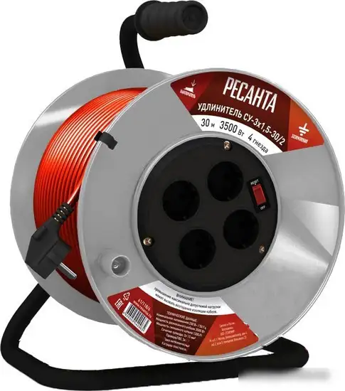 Удлинитель Ресанта СУ-3х1.5-30/2 предназначен для подачи электроэнергии в домашних и рабочих условиях. Он имеет четыре выходные розетки, что позволяет подключать несколько приборов одновременно. Максимальная нагрузка составляет 3500 Вт, а кабель длиной 30 метров дает большую свободу передвижения. В корпусе используют яркие цвета — красный, серый и черный — для легкой идентификации. Кабель хранится на катушке, что удобно для хранения и транспортировки. Светодиодная индикация показывает, когда устройство включено и работает. Устройство работает при напряжении 0–250 В, что подходит для различных электросетей. Вес изделия — 4.12 кг, и оно устойчиво во время использования. Встроенная катушка помогает аккуратно наматывать и разматывать кабель, предотвращая запутывание. Такой удлинитель — хорошее решение для организации электроснабжения в любой ситуации.