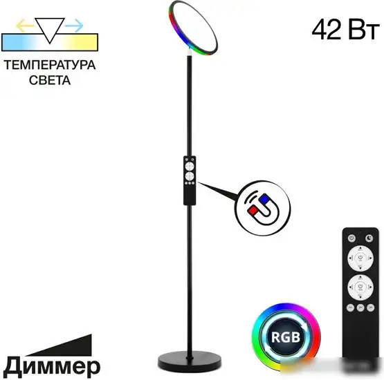 Торшер Citilux Click CL810021 RGB отлично подходит для создания уютной атмосферы в любой комнате. Он оснащён двумя светодиодными лампами мощностью 42 Вт, которые обеспечивают яркое и равномерное освещение. Благодаря регулируемому наклону плафона вы легко направите свет туда, где он нужен. Управление осуществляется дистанционно с помощью комплекта, что делает использование удобным. Торшер поддерживает регулировку яркости и температуры света, позволяя выбрать тёплый, нейтральный или холодный свет, а также мультицветные режимы. Он оснащён режимом ночника, таймером и лампой для чтения, что расширяет его функциональность. Стильный чёрный каркас из металла делает его современным дополнением интерьера. Размеры — 25×25×177 см — позволяют устанавливать его в разные пространства. Каркас гарантирует прочность и долговечность, а наличие дополнительных функций повышает комфорт при использовании.