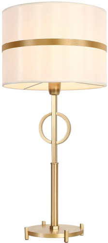 Настольная лампа Favourite Mateo 2634-1T выполнена из металла с золотистой рамой и текстильным абажуром бежевого цвета. Она светит мощностью 40 Вт с цоколем E14, подключается к электросети и легко размещается на столе. Лампа имеет компактные размеры — 27 см в длине и ширине, и высоту 57 см, а её вес составляет 2,9 кг. Благодаря простому дизайну она подойдет для любой комнаты, создавая теплое освещение. Лампа не оснащена регулировками яркости или температуры света, а также дистанционным управлением. Простая конструкция делает её удобной в использовании и уходе.