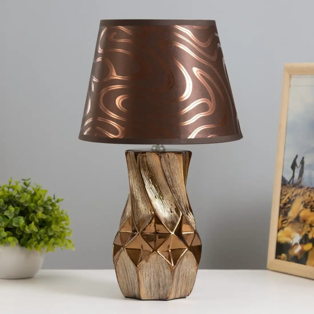 Торшер Risalux Исланта 9673037 легко добавит тёплый свет в вашу комнату. Он размещается на столе и имеет стильный золотистый каркас из керамики. Плафон выполнен из текстиля в коричневом цвете с рисунком, создавая уютную атмосферу. Он подключается к сети через стандартный цоколь E14. Торшер включает встроенный выключатель для удобного управления светом. Он не оснащён дистанционным управлением и регулятором яркости, но обеспечивает стабильное освещение. Его можно использовать в различных комнатах, кроме детской, благодаря классическому дизайну. Крепёж и материалы позволяют легко установить и гармонично вписать в интерьер. Этот торшер аккуратно освещает пространство, не перегружая его лишними функциями.