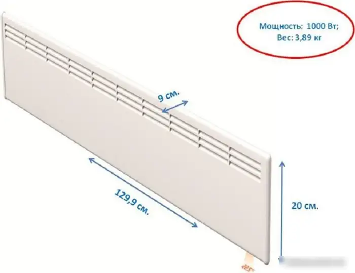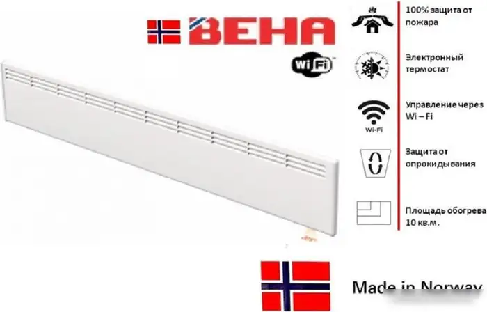 Конвектор Beha LV 10 Wi-Fi легко монтируется на стену и подходит для обогрева до 10 м². Он имеет мощность 1000 Вт и использует монолитный излучатель, быстро прогревая комнату. Управлять устройством можно как механически, так и с помощью смартфона через WIFI, что удобно и позволяет настроить тепло даже на расстоянии. Встроенный термостат поддерживает комфортную температуру, а регулировка уровня мощности помогает адаптировать работу к потребностям. Конвектор защищён влагозащитным корпусом IP24 и автоматически отключается при перегреве для безопасности. Он также включает режим предотвращения замерзания, что защищает помещение в холодное время. Размеры устройства — 129.9 см в ширину, 20 см в высоту и 9 см в глубину, а вес составляет около 3.9 кг. Это делает его компактным и лёгким в установке и использовании.