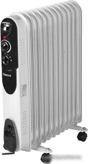 Масляный радиатор Eurolux ОМПТ-EU-12Н имеет 12 секций и мощность 2 500 Вт, что позволяет быстро обогревать помещение площадью до 30 м². Он работает при напряжении 230 В и имеет механизмическое управление с возможностью регулировки уровня мощности, что помогает выбрать комфортную температуру. Радиатор легко перемещать благодаря комплекту колёс с креплениями, он устойчиво стоит на ножках. Встроенный термостат регулирует работу устройства и поддерживает тепло, а функция защиты от замерзания обеспечивает безопасность в холодное время. Радиатор не оснащён тепловентилятором, дисплеем или возможностью управления со смартфона, но его корпус защищён от влаги и безопасен в использовании. В комплект также входят паспорт, упаковка и инструкция по эксплуатации. Модель представлена в белом или чёрном цвете.