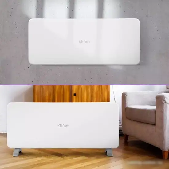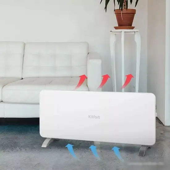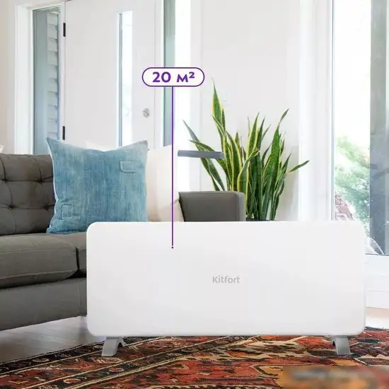 Конвектор Kitfort KT-2707 – это устройство для обогрева помещений площадью до 20 м². Он имеет мощность 2000 Вт, что обеспечивает быстрое и эффективное тепло. Конвектор выполнен в белом цвете и устанавливается на стену, что saves пространство. Он управляется механически и имеет регулировку уровня мощности, а также встроенный термостат для поддержания комфортной температуры. Размеры прибора: шириной 92 см, глубиной 24 см и высотой 43 см, весит всего 5,2 кг, что облегчает монтаж и переноску.