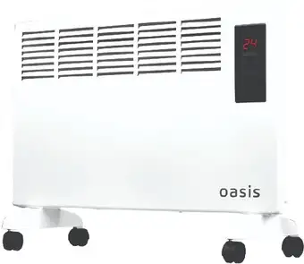 Конвектор Oasis DK-15 — это устройство для обогрева помещений площадью до 20 м2. Он работает на мощности 1500 Вт и имеет монолитный X-образный нагревательный элемент, который быстро нагревает воздух. Управлять кондиционером удобно благодаря сенсорной панели, таймеру и пульту дистанционного управления. Он также оснащён встроенным термостатом, который помогает поддерживать комфортную температуру. Конвектор легко монтируется на стену и не занимает много места. Он не имеет тепловентилятора или функций очистки воздуха, но помогает быстро прогреть комнату и экономит энергию. Также есть регулировка уровня мощности и дисплей для контроля настроек. Устройство легко перемещать, так как в комплектацию входят ножки и ролики.