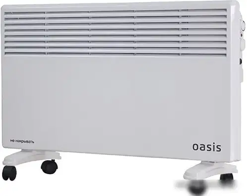 Конвектор Oasis LK-20 — это устройство мощностью 2000 Вт, предназначенное для обогрева помещений площадью до 25 м². Он работает от стандартной сети 220 В и оснащён механическим управлением с регулировкой уровня мощности. Конвектор автоматически отключается при перегреве, что обеспечивает безопасную эксплуатацию. Его можно настенно установить, что экономит место в комнате. В комплект входят ножки, ролики, монтажный и монтажный комплект, а также руководство по эксплуатации. В устройстве нет дисплея, и оно не управляется дистанционно или через смартфон. Благодаря компактным размерам и весу 4,1 кг, его легко перемещать и устанавливать. Цвет — белый, корпус не защищён от влаги, но есть встроенный термостат. Это Надёжный обогреватель для дома и офиса, который проста в использовании и обслуживании.