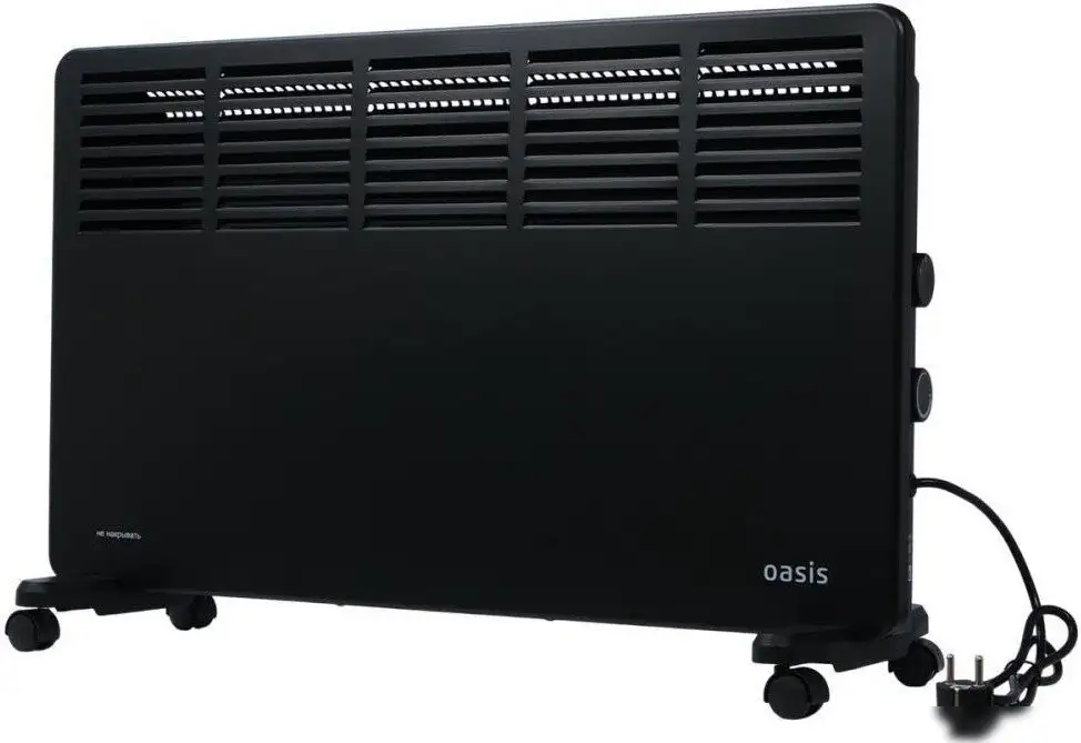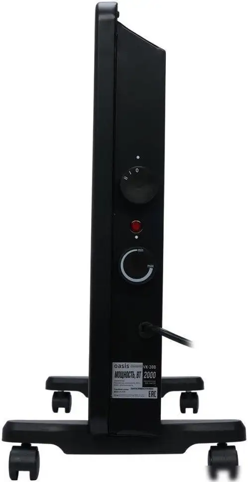 Конвектор Oasis VK-20B предназначен для обогрева помещений площадью до 25 м2. Он работает от сети 230 В и обладает мощностью 2000 Вт, что позволяет быстро нагреть комнату. Устройство управляется механическим термостатом без выбора конкретной температуры, что просто и удобно в использовании. Конвектор не оснащён тепловентилятором, дисплеем или функциями очистки воздуха, увлажнения и управления со смартфона. Он монтируется на стену, что экономит пространство, и комплектуется колесами для перемещения. Важной особенностью является автоматическое отключение при перегреве для обеспечения безопасности. Конвектор имеет компактные размеры: ширина 75,5 см, глубина 25 см и высота 48,6 см, весит всего 3,3 кг. Такой обогреватель подходит для постоянной эксплуатации и легко устанавливается в доме или офисе.