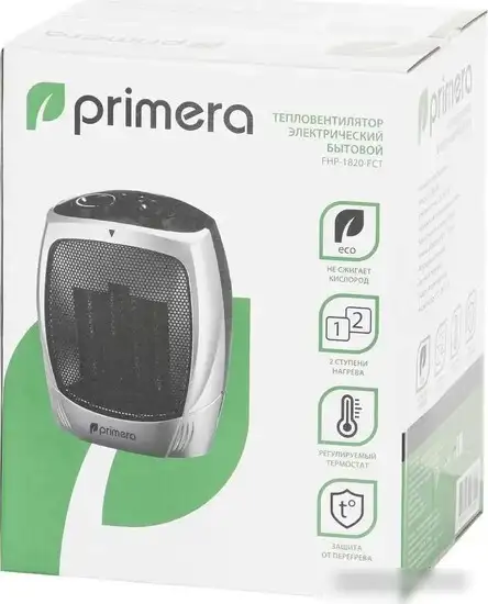 Конвектор Primera FHP-1820-FCT отлично подходит для обогрева помещений площадью до 15 м². Он оснащён керамическим нагревательным элементом, который быстро и равномерно нагревает комнату. Мощность устройства составляет 1800 Вт, что позволяет регулировать уровень тепла в два режима — 900 и 1800 Вт. У конвектора есть механическая панель управления и встроенный термостат, что помогает поддерживать комфортную температуру. В устройство встроен тепловентилятор для ускорения нагрева воздуха. Оно автоматически отключается при опрокидывании или перегреве, обеспечивая безопасность эксплуатации. Переключение между режимами помогает выбрать более экономичный или быстрый режим нагрева. В конструкции отсутствует дисплей и охлаждение воздуха, а управление осуществляется только механически. Кроме того, конвектор легко переносится благодаря компактным размерам и небольшому весу.