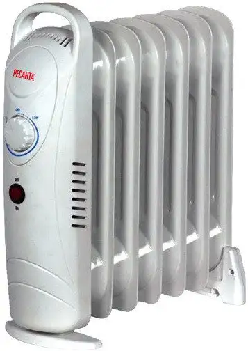 Масляный радиатор Ресанта ОММ-7Н — это устройство с 7 секциями и мощностью 700 Вт, которое поможет обогреть площадь до 7 м². Он имеет классический белый цвет и управляется механическим переключателем, что делает его простым в использовании. Радиатор оснащён термостатом, который помогает поддерживать комфортную температуру в комнате и отключается при перегреве для безопасности. Его габариты — 43 см в ширину, 13 см в глубину и 37 см в высоту, а вес всего 4.9 кг, что облегчает перемещение. В основе модели лежит масло, которое долго сохраняет тепло и равномерно обогревает помещение.