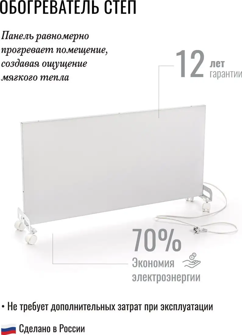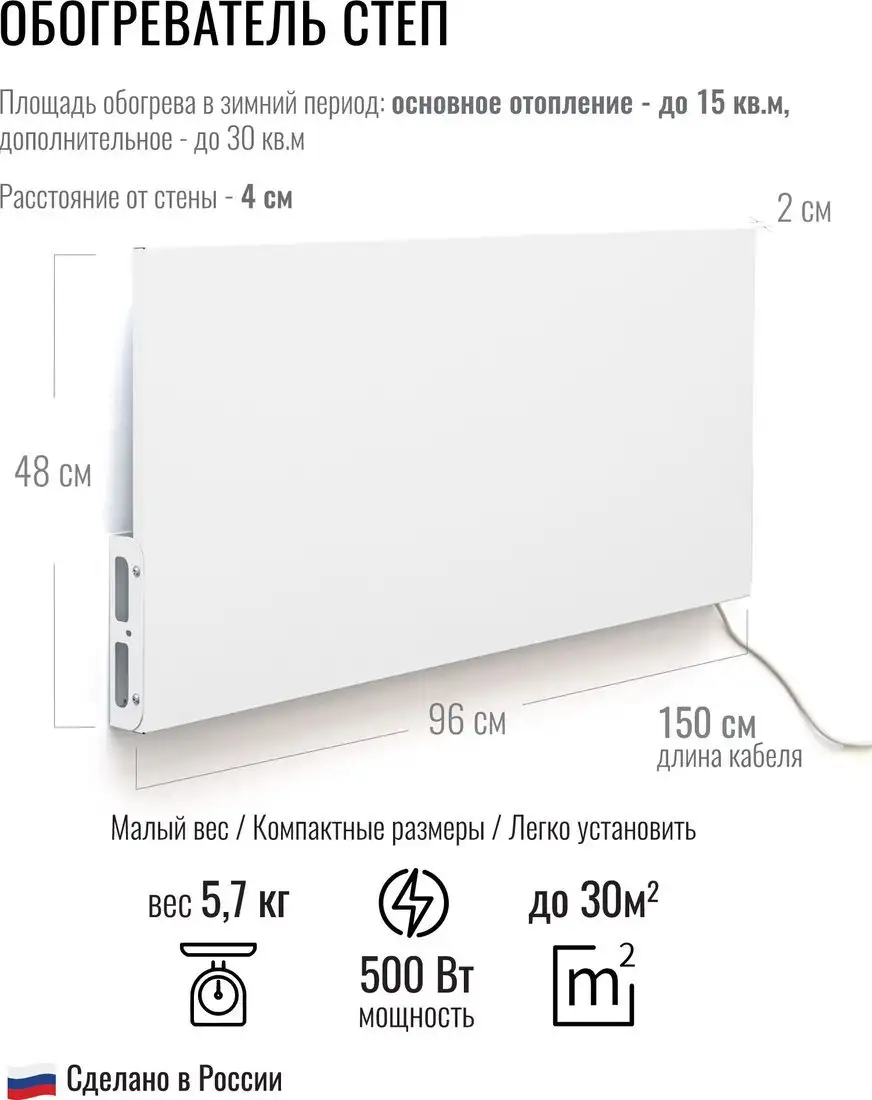 Инфракрасный обогреватель СофтТерм DUOS 220/500 произведён в России и предназначен для обогрева помещений площадью до 12 м². Он обеспечивает мощность 500 Вт и питается от сети 230 В. Обогреватель монтируют на стену, он оснащён влагозащитным корпусом с классом IP66, что делает его безопасным в различных условиях. Управление осуществляется механически, что позволяет легко регулировать уровень мощности. Встроенный термостат помогает поддерживать комфортную температуру автоматически. Обогреватель отличается простотой в установке и безопасностью, входит в комплект с крепежом и руководством. Он не имеет функций управления смартфоном, дисплея или режимов увлажнения и очистки воздуха. Вес устройства — 5,7 кг, размеры: ширина 96 см, высота 48 см, толщина 2 см.