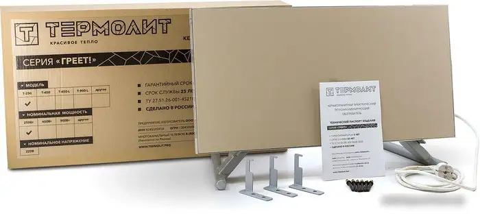 Инфракрасно-конвективный обогреватель Термолит ЭКО Т-300 предназначен для обогрева помещений площадью до 8 м2. Он работает от сети с напряжением 220 В и имеет мощность 300 Вт, что обеспечивает быстрый и равномерный нагрев. Устройство выполнено в бежевом цвете и защищено влагозащитным корпусом, что делает его безопасным и долговечным. Обогреватель устанавливают на стену, его легко монтировать без дополнительных усилий. Модель не имеет регулятора мощности, термостата или таймера, но обеспечивает стабильную работу в течение длительного времени. Благодаря компактным размерам — 60 см в ширину, 30 см в высоту и всего 2,3 см в глубину — он занимает мало места. Обогреватель прост в использовании и подойдет для обогрева небольших комнат или помещений с ограниченным пространством.