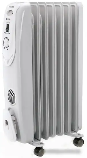 Масляный радиатор Vitek VT-1704 W — это устройство, которое быстро нагревает помещение до 20 м² благодаря мощности 1500 Вт и семи секциям. Управление происходит механически, есть три уровня мощности (600, 900 и 1500 Вт), что помогает правильно настроить тепло. Радиатор оснащён встроенным термостатом для автоматической работы и предохраняет от перегрева благодаря функции автоотключения. Корпус влагозащитный, что позволяет использовать его в разных условиях. Он весит около 9 килограммов и легко перемещается благодаря ручкам. Этот радиатор отлично подходит для обогрева дома или офиса, обеспечивая комфорт и безопасность.