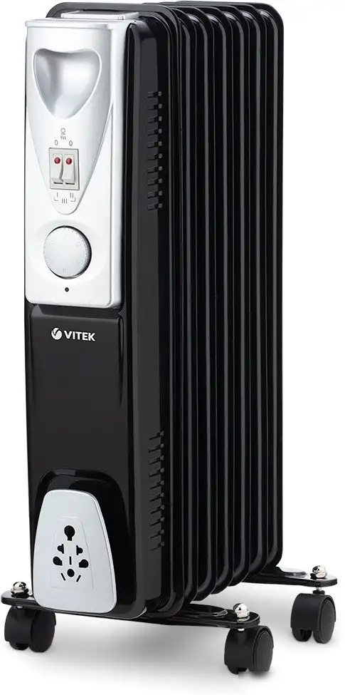 Масляный радиатор Vitek VT-1717 — это устройство для обогрева помещений площадью до 15 м2. Он оснащён 7 секциями, что обеспечивает равномерное распределение тепла. Мощность радиатора составляет 1500 Вт, и он работает от сети 230В. Управление осуществляется с помощью механической ручки, есть регулировка уровня мощности и встроенный термостат для поддержки комфортной температуры. Радиатор оборудован колесиками, что облегчает его перемещение, а также системой автоотключения при опрокидывании или перегреве для безопасности. Он не имеет функции очистки воздуха, увлажнения или подключений к смартфону. Вес устройства составляет всего 6 кг, что делает его удобным и простым в использовании.