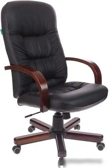 Кресло Бюрократ T-9908/WALNUT в черном цвете идеально подходит для руководителя. Оно выполнено из искусственной кожи, которая легко очищается и выглядит аккуратно. Спинка из цельной конструкции обеспечивает хорошую поддержку спины, а встроенный подголовник помогает сохранить комфорт. Подлокотники сделаны из дерева, что придает креслу стильный вид и надежность. Механизм качания с системой DMS позволяет выбрать приятное положение для отдыха и работы. Крестовина из дерева обеспечивает устойчивость, а мягкие резиновые ролики легко катятся по твердым покрытиям. Газовая пружина регулирует высоту сиденья, позволяя настроить его под ваш рост. Конструкция не имеет массажа или регулировки наклона спинки, что делает её простой в использовании. Это кресло отлично подходит для длительной работы и обладает высокой надежностью.