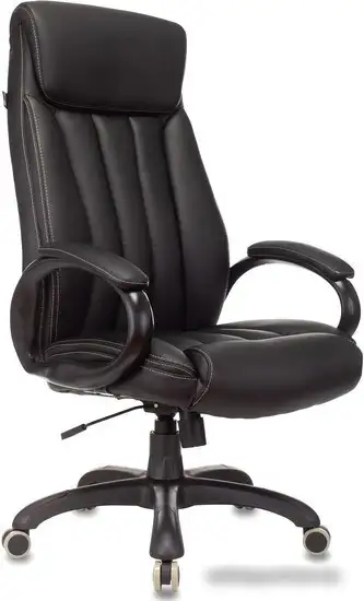 Кресло Бюрократ T-9922N в черном цвете — это удобное кресло для руководителя. Оно сделано из искусственной кожи, что позволяет легко ухаживать за ним и долго сохранять внешний вид. В кресле есть подголовник и подлокотники, которые обеспечивают комфорт при длительной работе. Оборудовано пластиковой крестовиной и роликами с резиновым покрытием, что позволяет легко перемещаться и защищает пол от царапин. Механизм качания DMS (Tilt) дает возможность немного раскачиваться для расслабления. Максимальная нагрузка кресла составляет 200 кг, а его размеры позволяют удобно разместиться за рабочим столом. Это модель без регулировки наклона и подголовника, но с хорошей устойчивостью и прочностью.