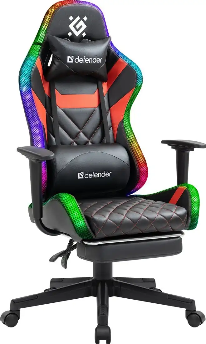 Это игровое кресло Defender Lumos создано для комфортной дружелюбной игры. Оно выполнено из искусственной кожи, что делает его прочным и легко моющимся, а спинка полностью цельная для хорошей поддержки спины. Кресло можно регулировать по наклону до 150° и поднимать подголовник и поясничную подушку для максимального удобства. Есть пластиковые ролики для мягкого скольжения по ковролину и металлическая газовая пружина для плавного поднятия. Особенности кресла включают подсветку и пульт дистанционного управления, что помогает создать нужную атмосферу. Размеры кресла позволяют сидеть в комфортной позе, а его вес около 18 кг легко перемещать. Это хорошее решение для любителей игр, которые ценят удобство и стиль.