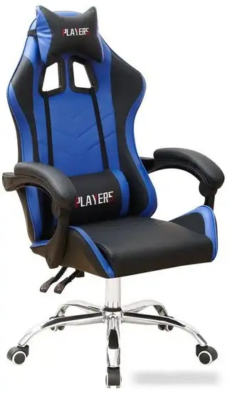 Это геймерское кресло BMG-01 в черном и синем цветах. Оно сделано из искусственной кожи, которая легко очищается и долго служит. В кресле есть подголовник и подушки для поясницы, что помогает поддерживать правильную осанку во время игр или работы. Кресло можно регулировать по высоте, а механизм качания позволяет выбрать нужный уровень наклона. Для удобства есть мягкие подлокотники и прочная металлическая крестовина. Максимальная нагрузка — 120 кг, а ролики подходят для твердых покрытий. Это хорошее кресло для тех, кто хочет комфортно провести время за компьютером.