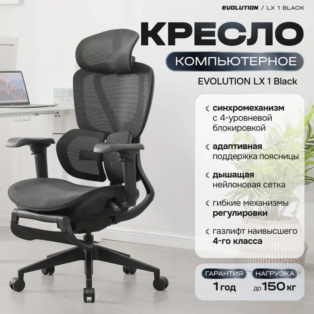 Офисное кресло Evolution LX 1 Black выполнено из сетки, которая обеспечивает хорошую вентиляцию во время долгого сидения. Оно имеет регулируемый наклон спинки от 110° до 135°, что помогает найти комфортную позу. Подголовник и подлокотники регулируются, чтобы поддерживать шею и руки, уменьшая усталость. Кресло оснащено синхромеханизмом для плавного качания и фиксируется в нужном положении. Поворотная крестовина и резиновые ролики позволяют легко передвигать кресло по твердым покрытиям. Газовая пружина дает возможность менять высоту сиденья от 78 до 82 см. Поясничный упор и глубина сиденья также регулируются для комфортной посадки. Максимальная нагрузка до 150 кг делает его прочным и надежным выбором. Размеры кресла и его прочность подходят для длительной работы в офисе или дома. Вес кресла — 20,6 кг, что обеспечивает устойчивость и долговечность.