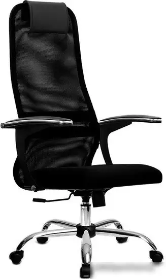 Кресло Metta SU-BU158-8 CH предназначено для руководителя и обладает современным дизайном в черном цвете. Оно имеет сетчатую спинку и сиденье на мягкой основе, что обеспечивает комфорт во время работы. Подголовник и подлокотники выполнены из искусственной кожи, что добавляет креслу стильный внешний вид. Металлическая крестовина и пластиковые ролики подходят для ковролина и увеличивают устойчивость. Газовая пружина позволяет регулировать высоту сиденья, а механизм качания DMS обеспечивает комфортное движение. В кресле не предусмотрена регулировка спинки или подголовника, но оно обладает функцией качания и наклона. Максимальная нагрузка составляет 120 кг, а размеры обеспечивают удобство для различных пользователей.