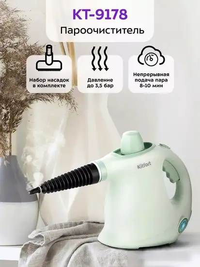 Пароочиститель Kitfort KT-9178 подходит для бытового использования и легко справляется с уборкой разных поверхностей. Его мощность составляет 1050 Вт, а давление пара достигает 3,5 бар, что обеспечивает хорошее очищающее действие. В устройстве есть функция подачи пара с регулируемым расходом, а также есть паровой удар для удаления трудных загрязнений. Большой набор насадок включает точечную форсунку, щетку для пола, насадку для окон, мягкой мебели и отпаривания, что делает устройство универсальным. Резервуар объемом 0,35 л нагревается всего за 3 минуты, а шнур длиной 2,8 м позволяет свободно подступать к труднодоступным местам. Встроенный предохранительный клапан защищает от перегрева, что повышает безопасность работы. Устройство компактное и легкое — всего 2,4 кг, оно удобно для хранения и перемещения.