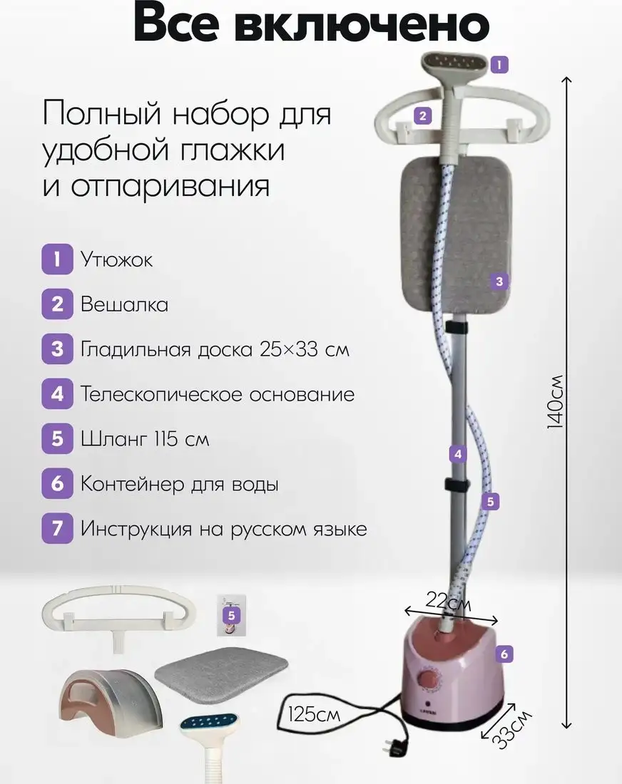 - Телескопическая штанга — регулирует высоту для удобства работы с разной одеждой.