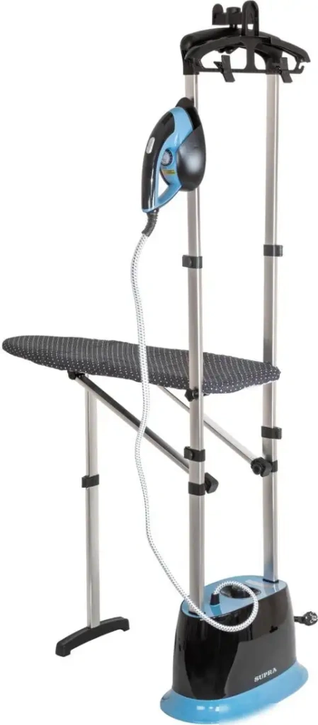 Отпариватель Supra SBS-301 предназначен для бытового использования и отличается компактным полным конструктивным исполнением. Он быстро нагревается за 2,5 минуты благодаря мощност�� нагревателя в 2500 Вт, что позволяет легко и быстро подготовить его к работе. Устройство создает давление пара до 4 бар, обеспечивая мощный поток пара до 42 г/мин для эффективной обработки тканей. Отпариватель оборудован телескопической штангой и вешалкой, которые помогут ухаживать за одеждой вертикально и удобно. Регулируемая гладильная доска и зажимы для брюк позволяют гладить разные виды одежды без лишних усилий. В комплекте есть утюг и щетка для более деликатной очистки тканей. Объем резервуара составляет 1 литр, а время нагрева — всего 2,5 минуты, что делает работу быстрой и комфортной. Устройство имеет длину шланга 1,35 м и шнура питания 1,6 м, что обеспечивает хорошую мобильность.