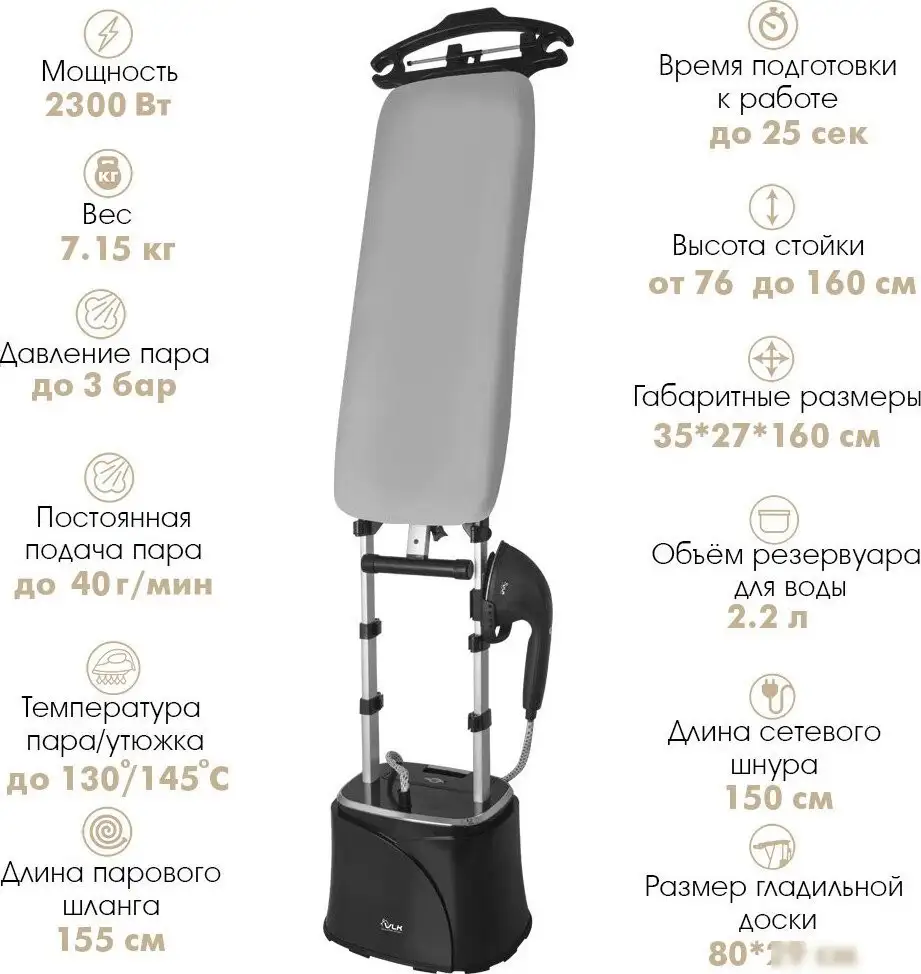 Гладильная станция VLK Rimmini 8800 создаёт комфорт при глажке дома. Её мощный нагреватель мощностью 2300 Вт быстро нагревает воду всего за 0,42 минуты. Максимальное давление пара достигает 3 бар, а выход пара — 40 г/мин — для быстрого разглаживания тканей. Три режима паровых настроек позволяют выбрать оптимальный режим для разных вещей. Обеспечена регулировка расхода пара и горизонтальное отпаривание, что делает процесс удобным и эффективным. В станции есть телескопическая штанга высотой 76-160 см и вешалка, что облегчает глажку одежды. Объем резервуара 2,2 л позволяет долго работать без долива воды. В комплект входит насадка-распылитель, щётка для очистки ткани и термостойкая рукавица для защиты. Устройство легко перемещать благодаря небольшим габаритам и весу 7,15 кг. Высокое качество сборки и простое управление делают глажку проще и приятнее.