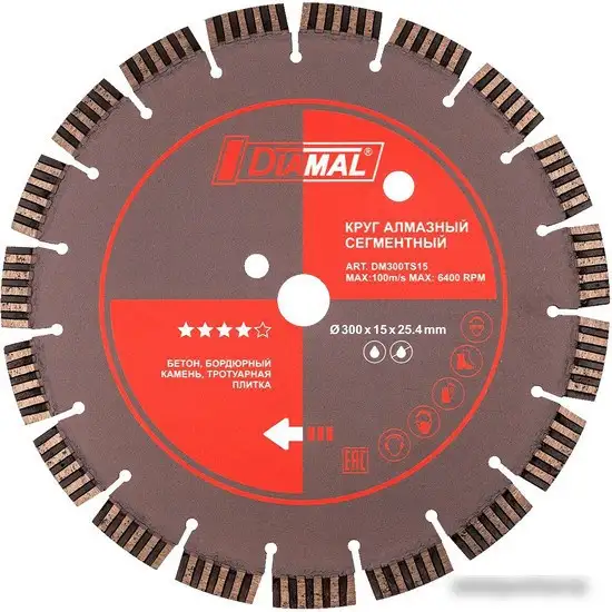 Алмазный отрезной диск Diamal DM1201 предназначен для работы с бетоном, бордюрным камнем и тротуарной плиткой. Он имеет диаметр 300 мм и посадочный диаметр 25.4 мм, что подходит для большинства профессиональных электропил и станков. Диск характеризуется резким и ровным срезом, что обеспечивает чистое и точное резание. Максимальные обороты диска — 6400 об/мин, что позволяет быстро справляться с тяжелыми материалами. Высота сегмента 15 мм делает работу более эффективной и долговечной. Этот диск подходит для сухого реза, что удобно при работе без системы водяного охлаждения. Он поставляется в комплекте из одного предмета, готов к использованию без дополнительных настроек.